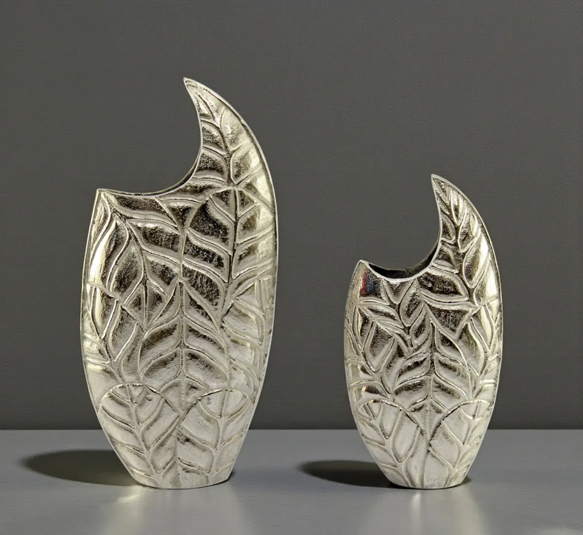 Enhance your decor with this striking silver metal vase, featuring an intricate embossed leaf texture and a unique wave-shaped rim. Its bright silver finish reflects light beautifully, making it a perfect centerpiece for modern homes.