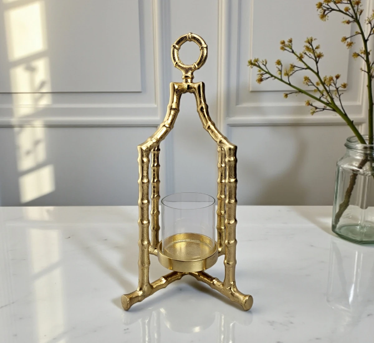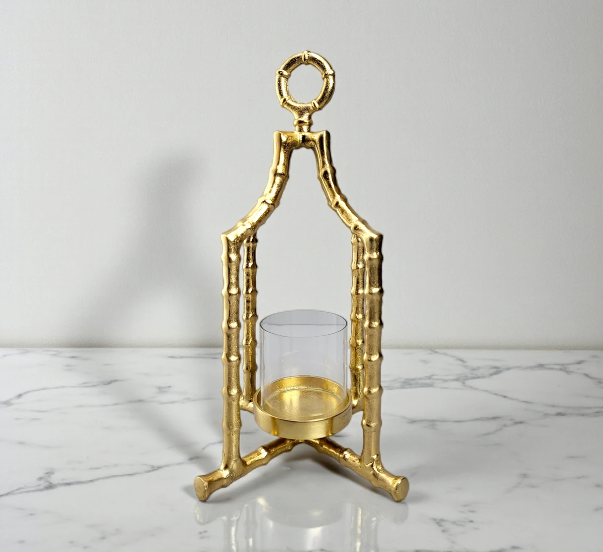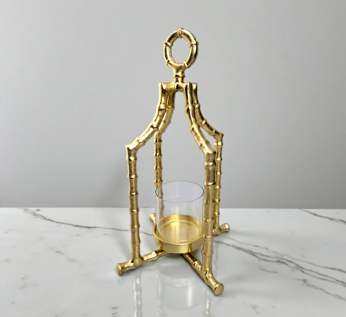 This gold-finished bamboo frame candle holder with glass insert is designed for luxury dining, hotels, wedding decor, and retail home decor collections.