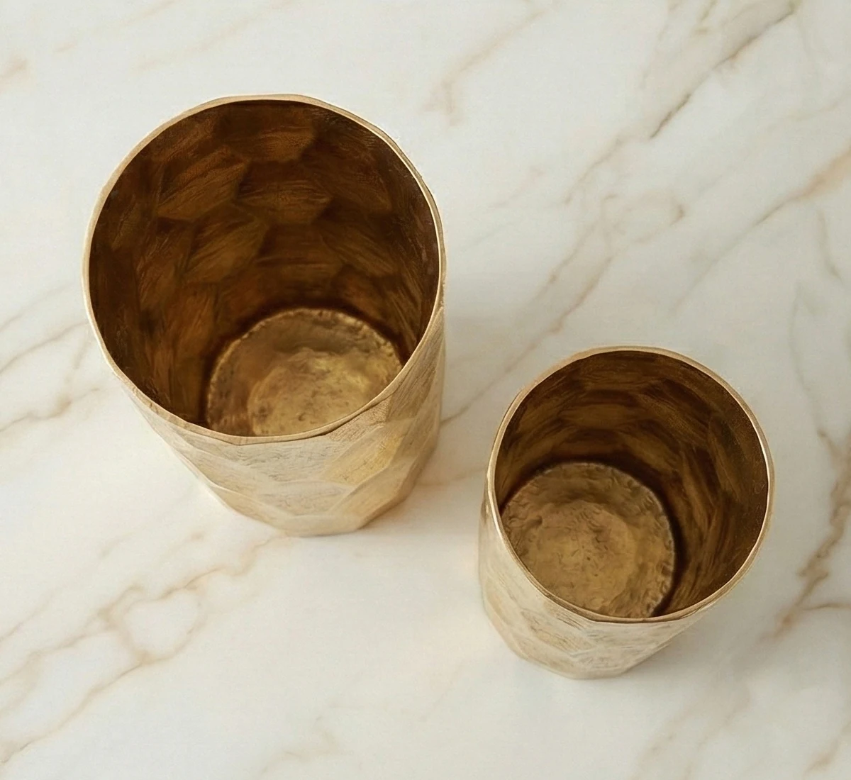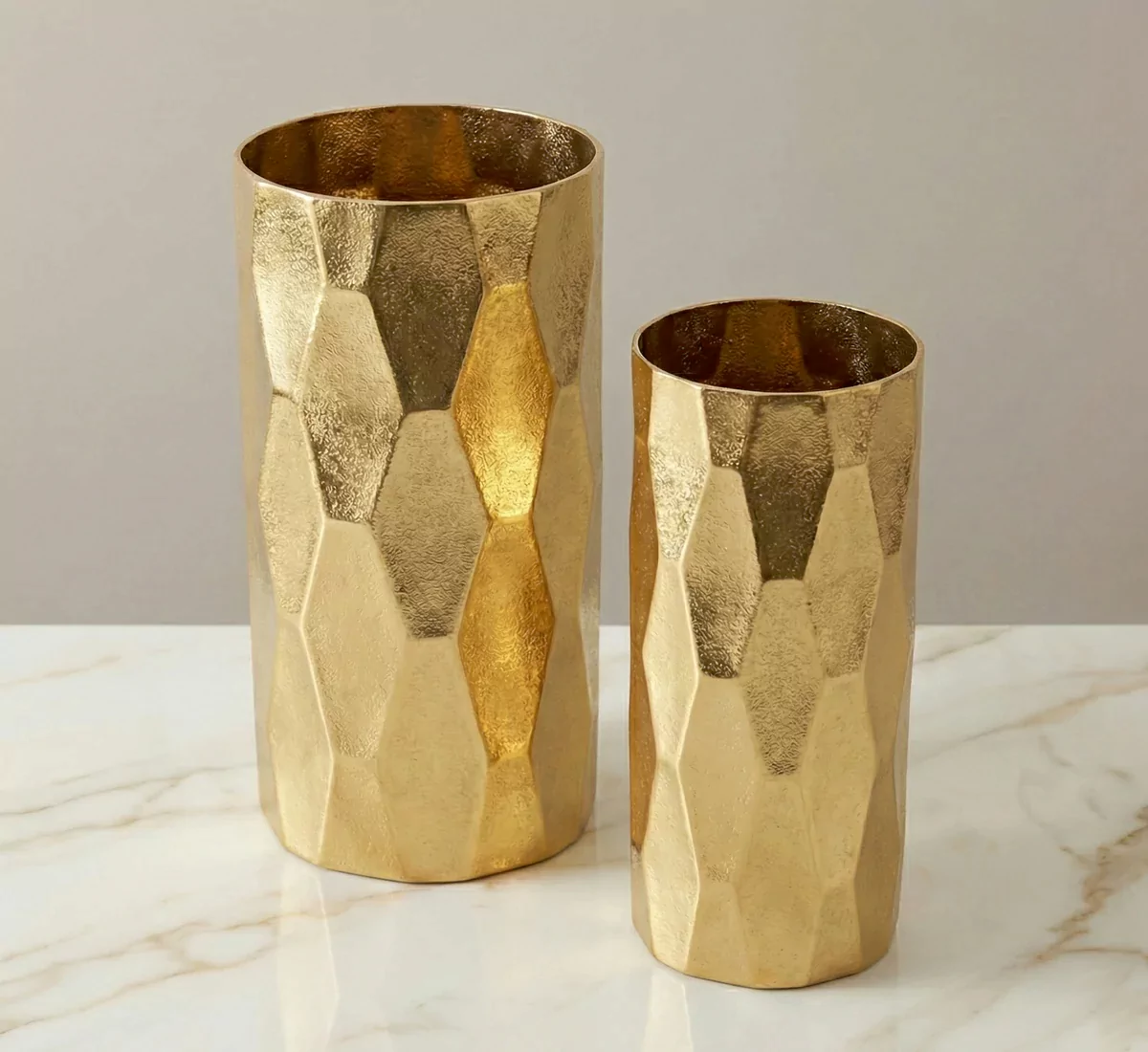 A statement of modern luxury. This set of two cylindrical gold vases features a stunning handcrafted faceted texture that mimics a honeycomb pattern. The reflective surface catches light beautifully, making it an ideal centerpiece.