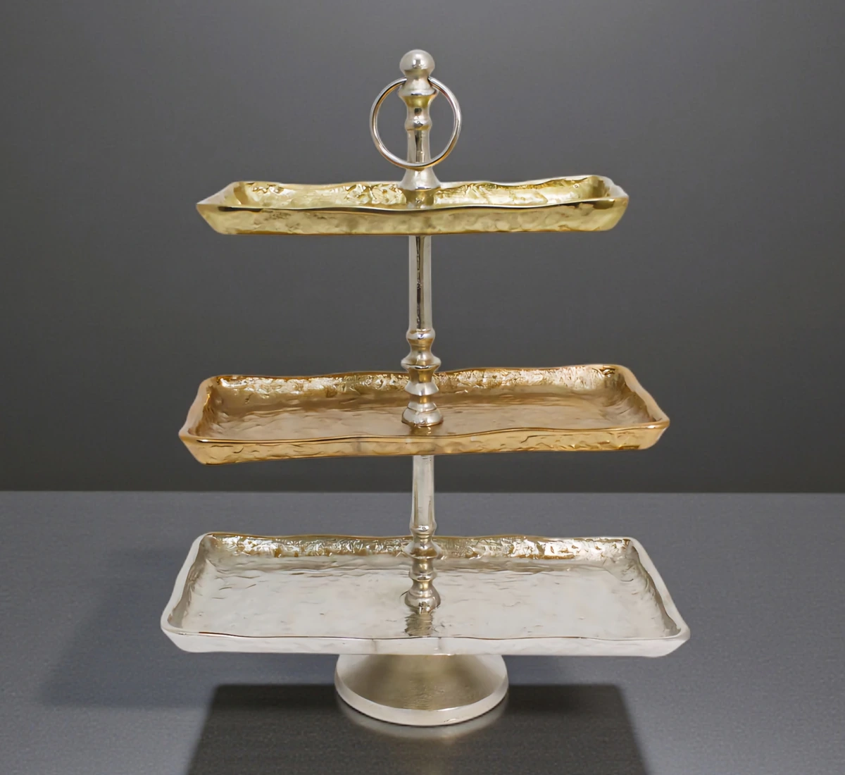 A striking three-tiered serving stand featuring rectangular trays in a mix of textured Gold and Silver finishes. With a silver central rod and ring handle, this mixed-metal piece is a versatile centerpiece.
